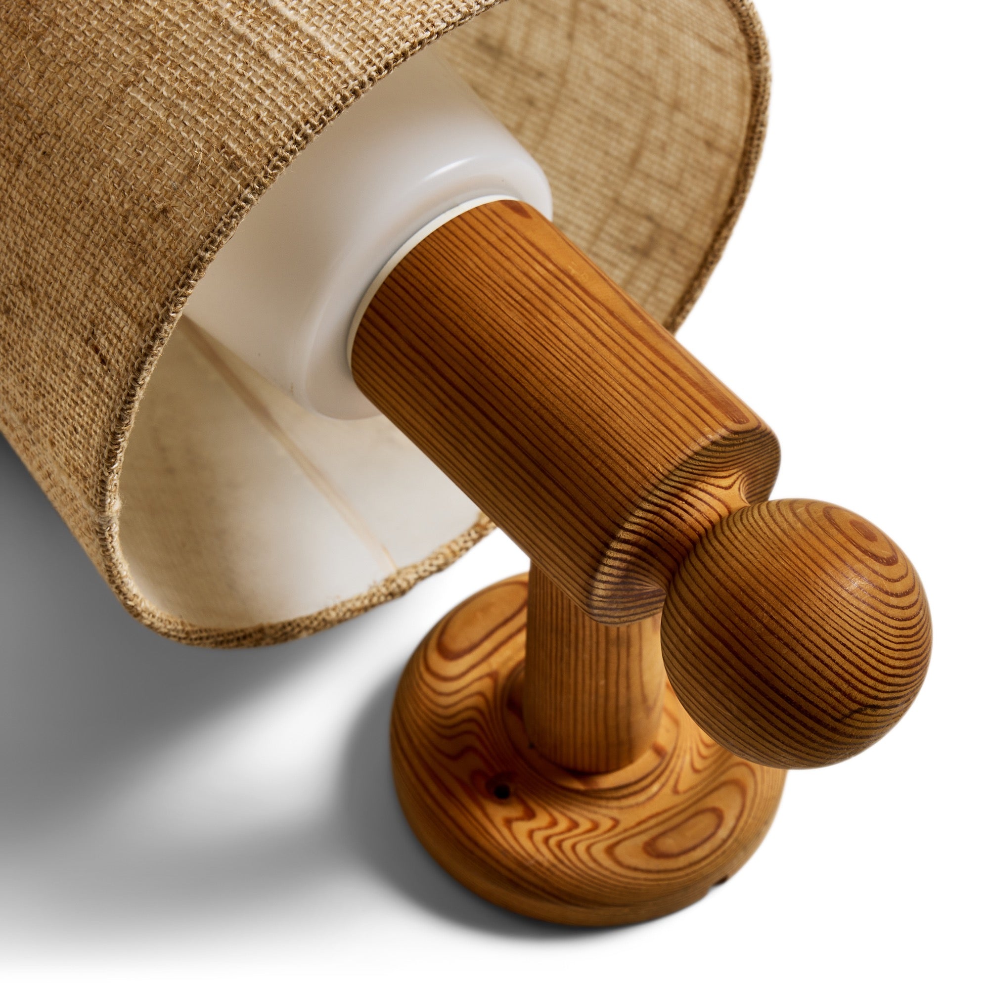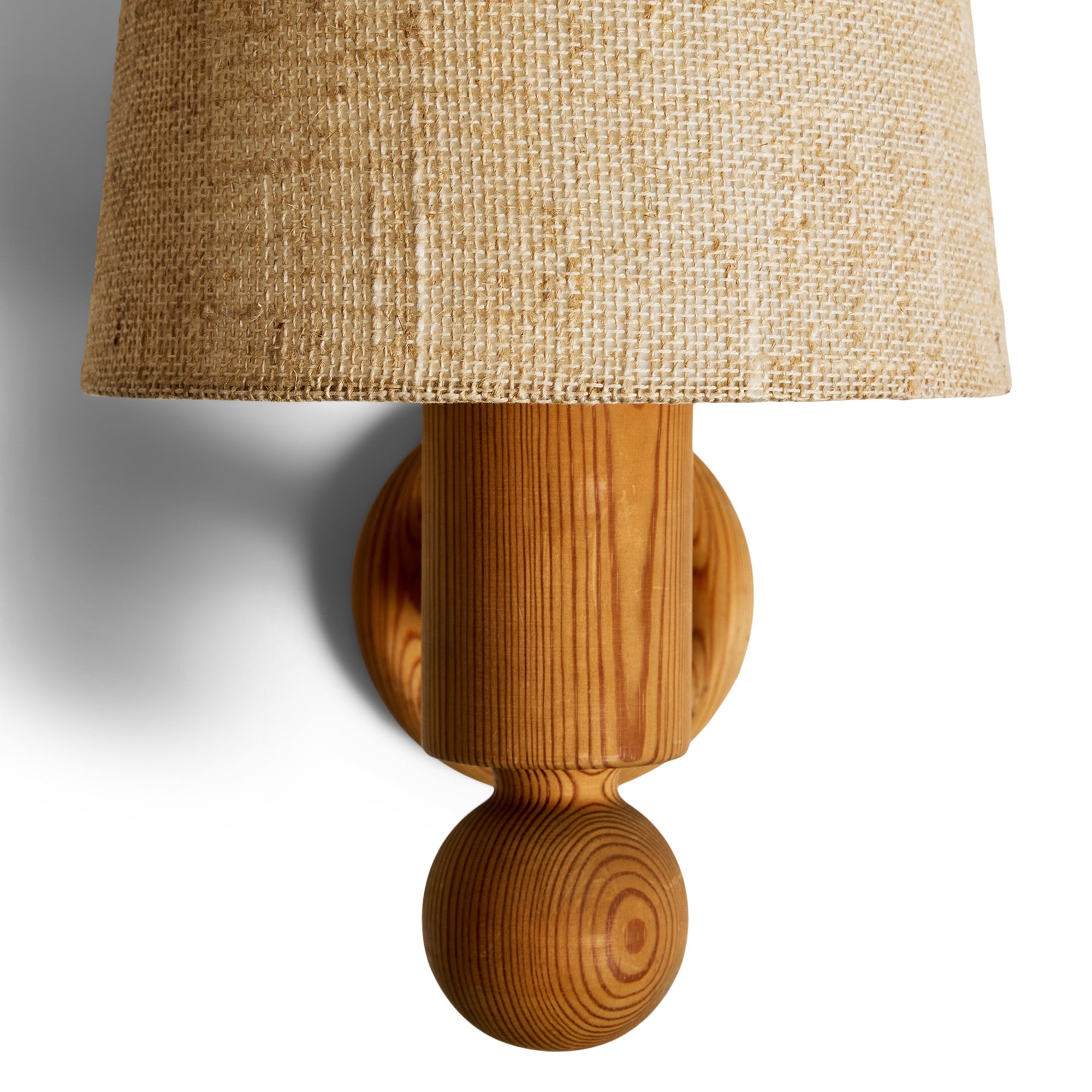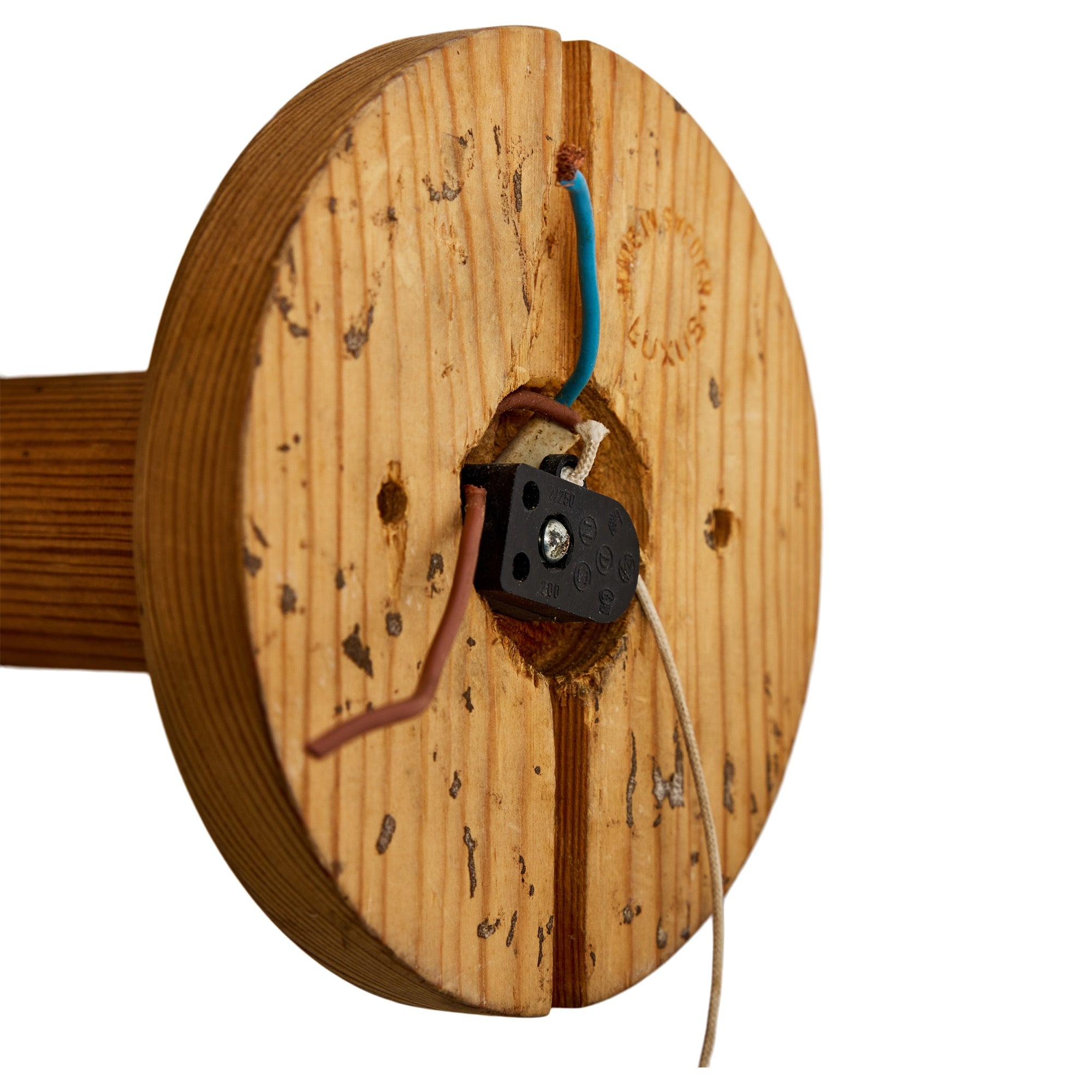 A sizable wall fixture crafted by Luxus and conceptualized by Uno Kristiansson around 1966. The primary structure of the design features intricately turned pine wood, complemented by white acrylic diffusers crowning the sconce and fabric shades enveloping the diffusers. Despite the lamps' curved form and contoured edges, their dimensions and the proportions of the employed shapes draw inspiration from Brutalist architecture. The use of wood in this fixture not only imparts visual warmth but also showcases its alluring grain and patina, adding to the overall aesthetic appeal.