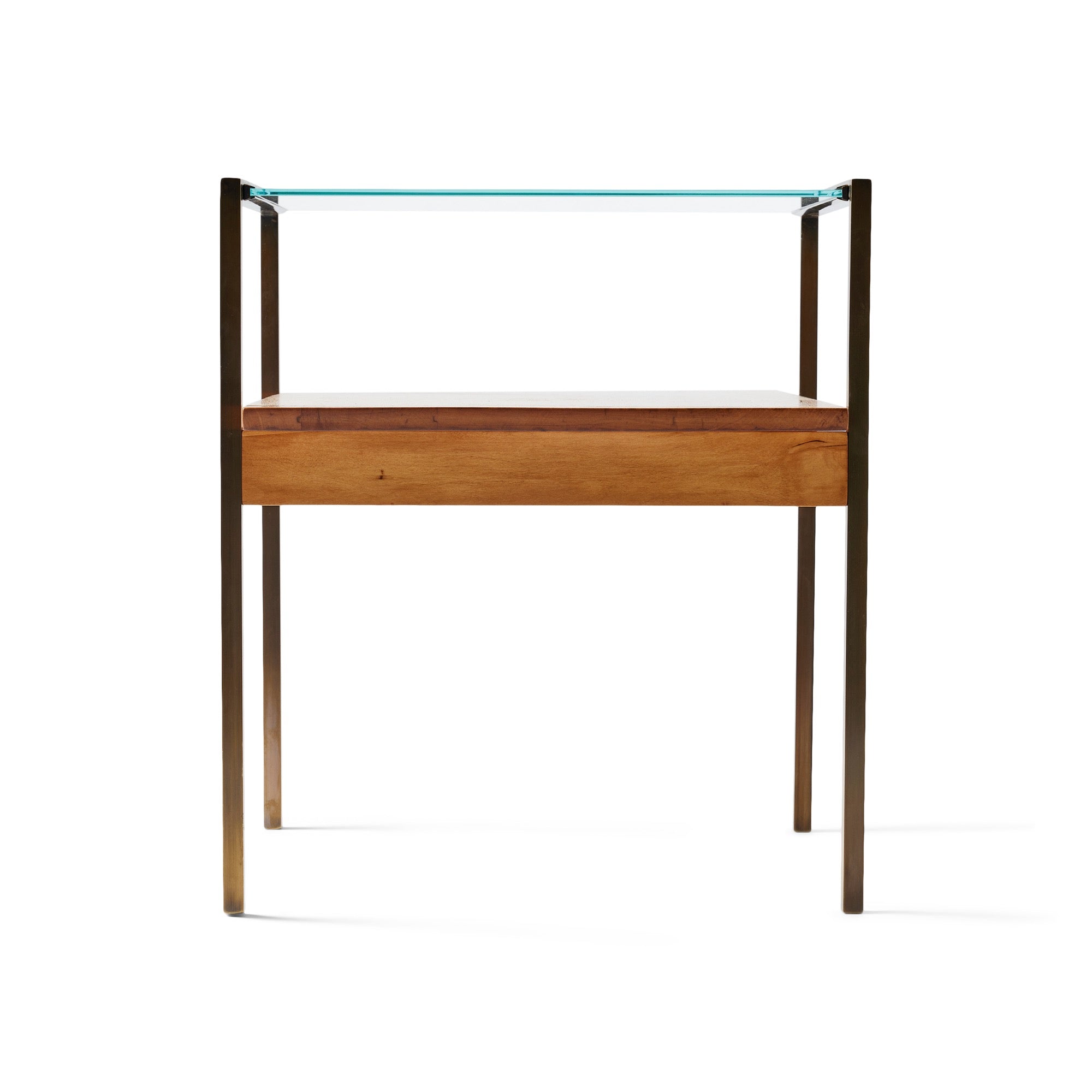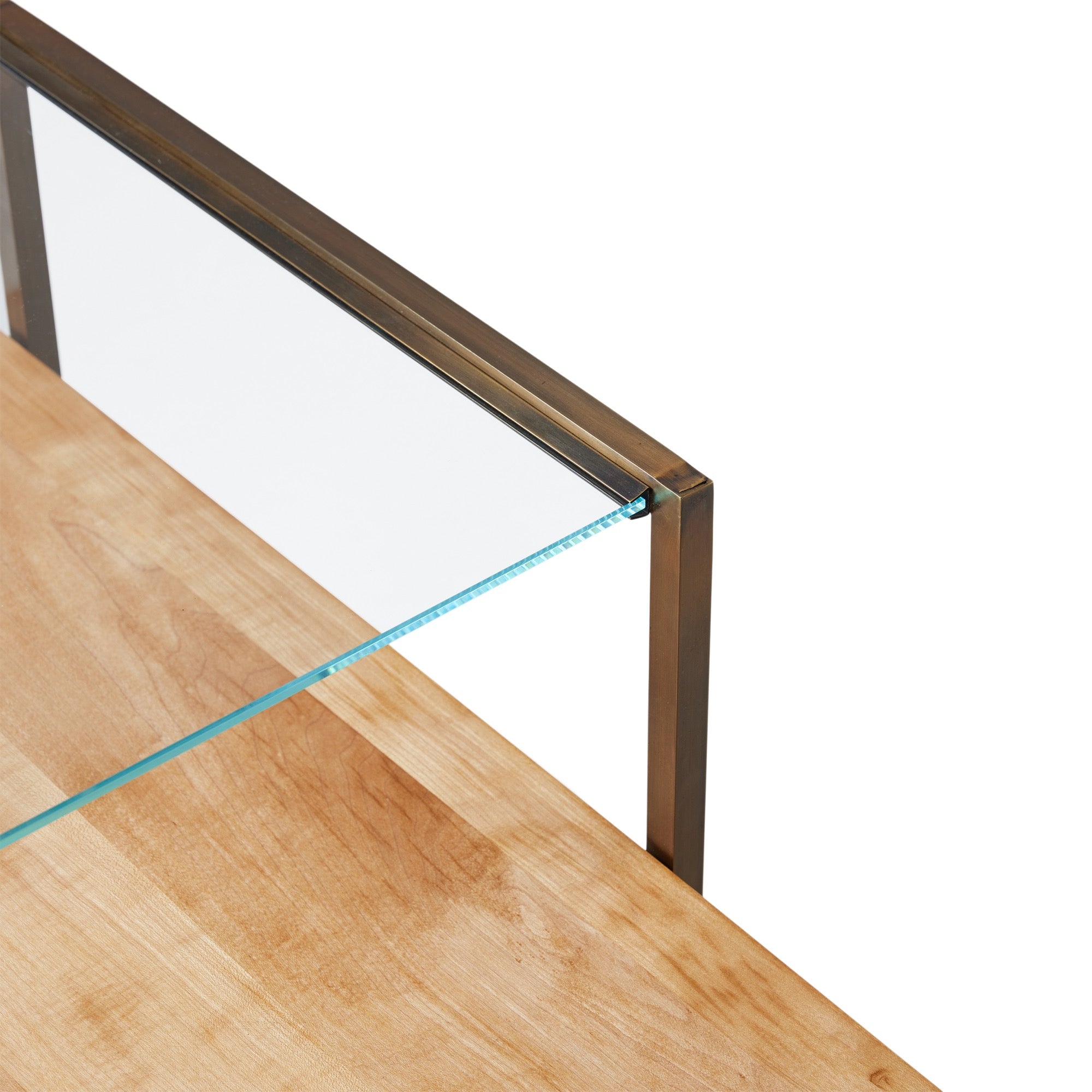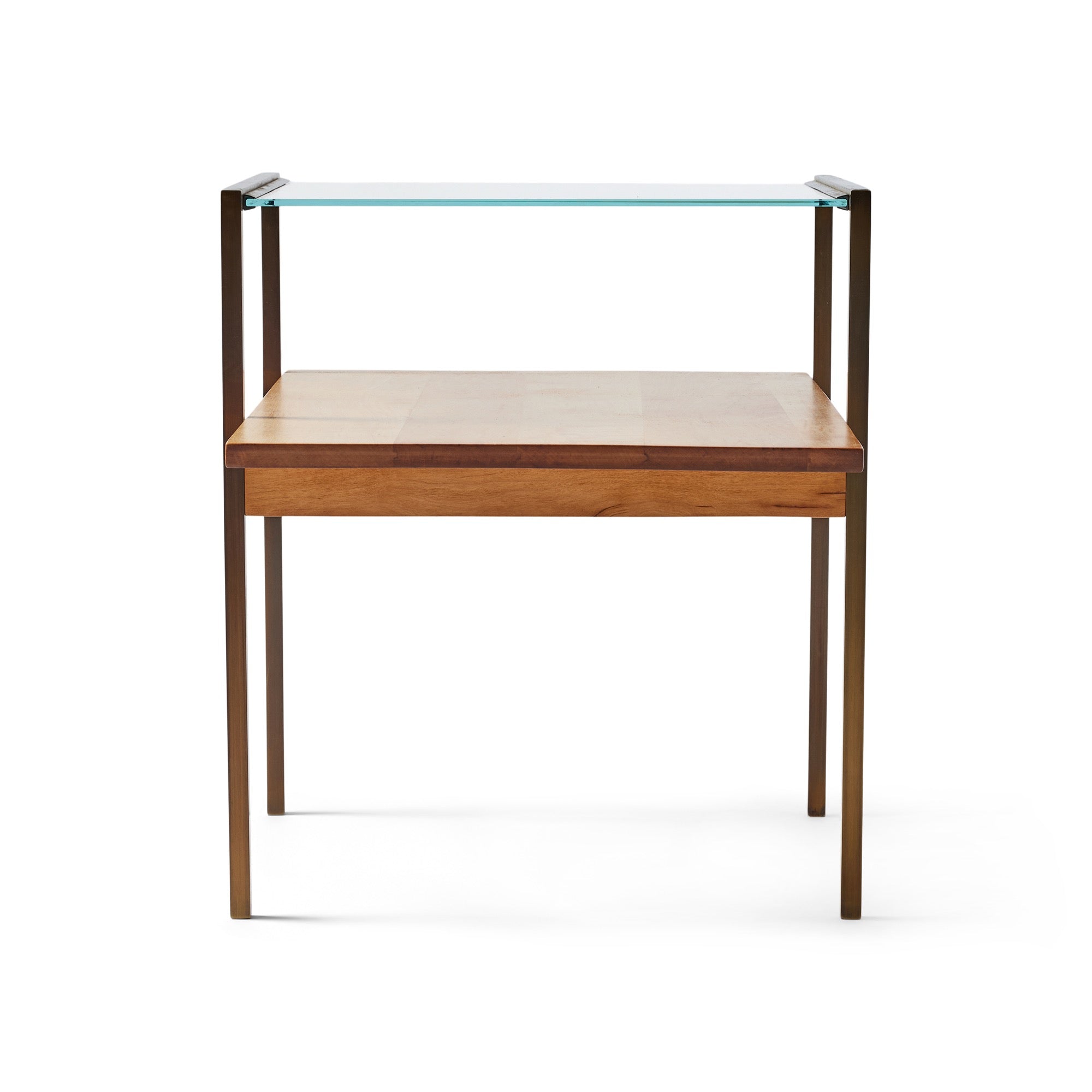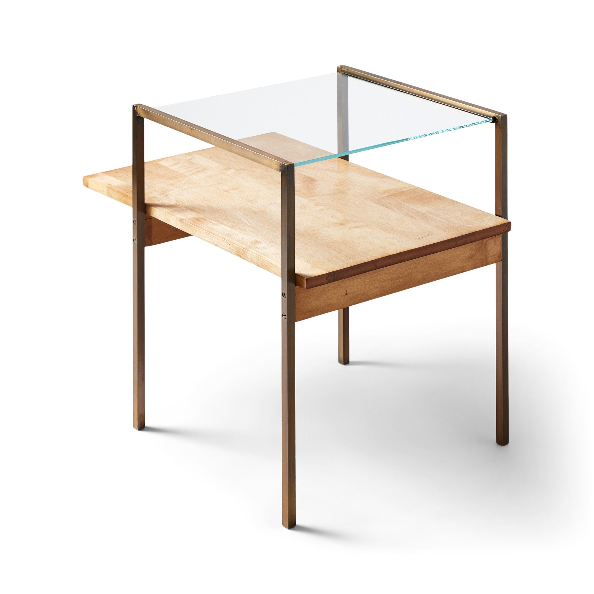 Minimalist end table having a glass top, a stepped wooden lower shelf, and squared brass frames.