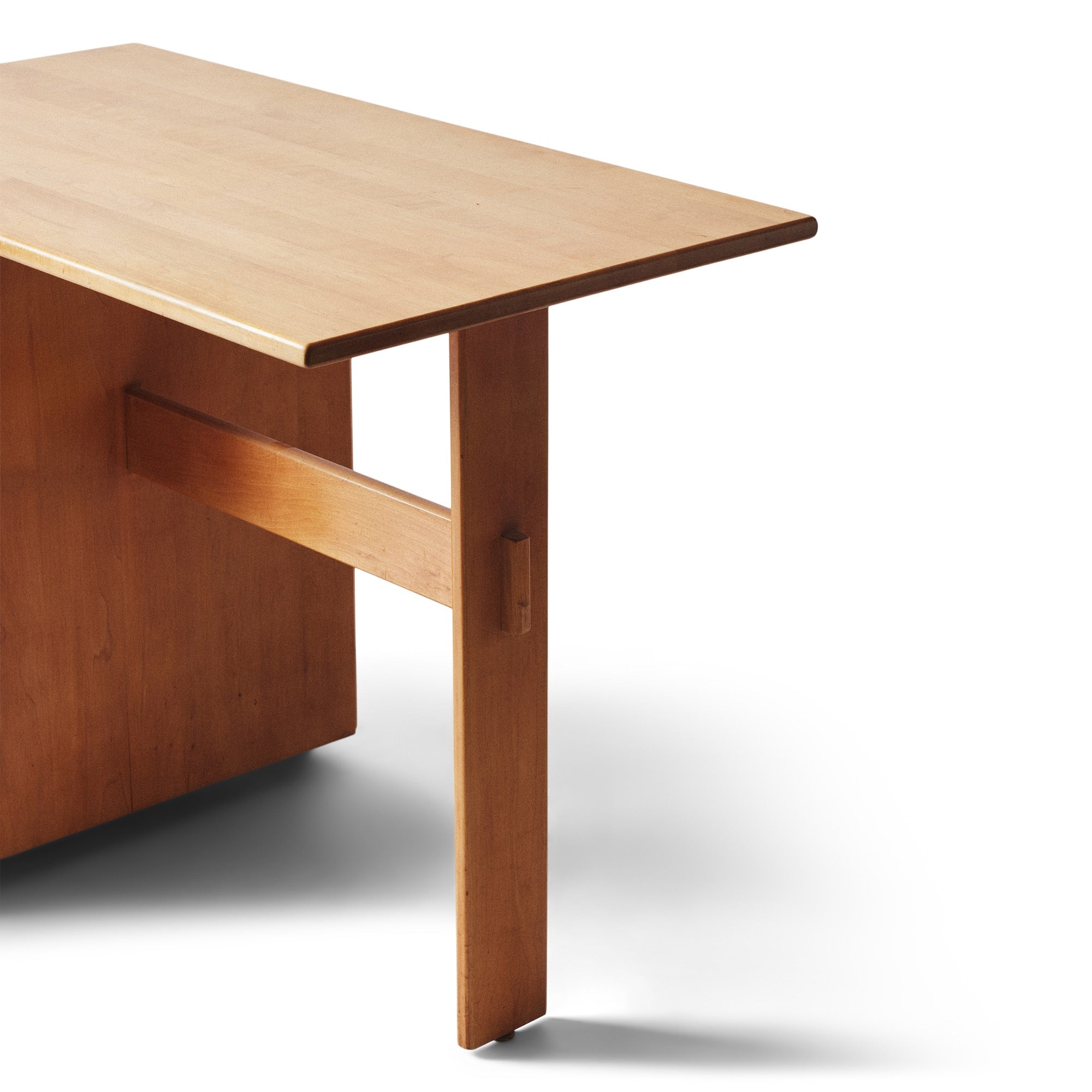 Desk in original light birch finish, featuring a minimal aesthetic, having clean lines and an asymmetrical layout. Supported on one side by a vertical slab leg joined by a horizontal stretcher. The other end is supported by a three drawer cabinet with recessed base, drawers each feature rectangular block pulls.
