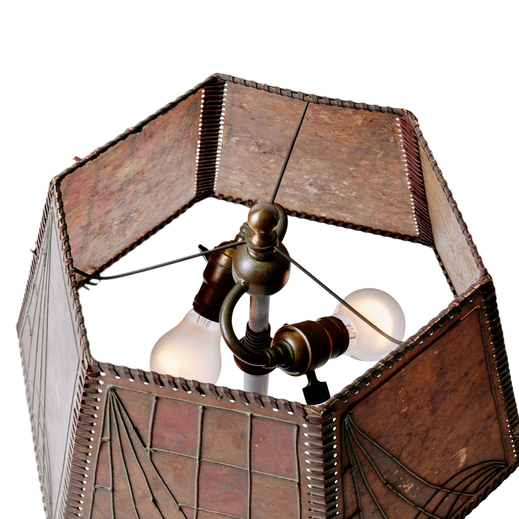 An Arts and Crafts period table lamp featuring a brass or bronze base with the original double socket cluster. The hexagonal mica shade appears to be original to the lamp. It is in warm earth tones with leaded joints, and the edges are carefully hand-stitched together in faux leather with several breaks in the cord.