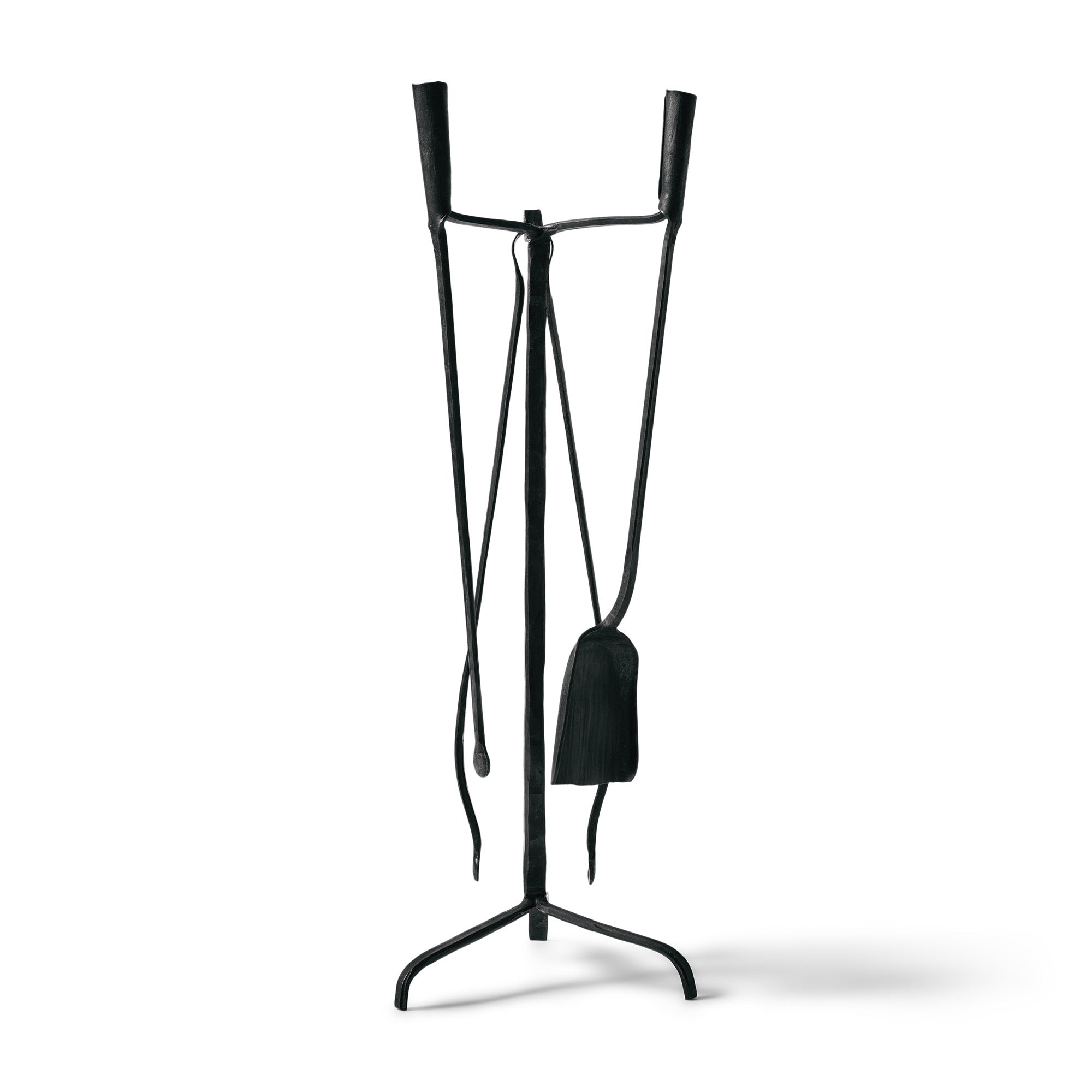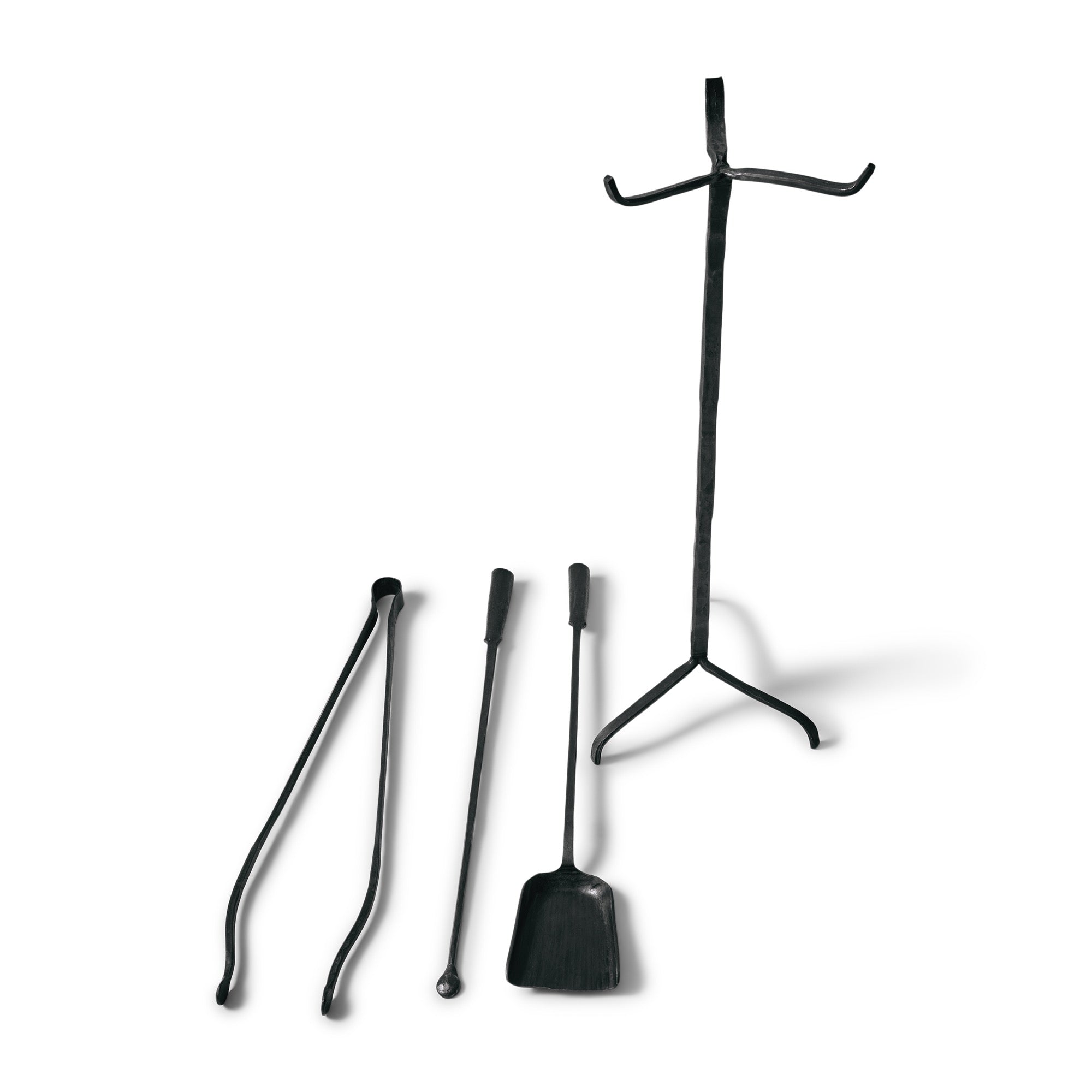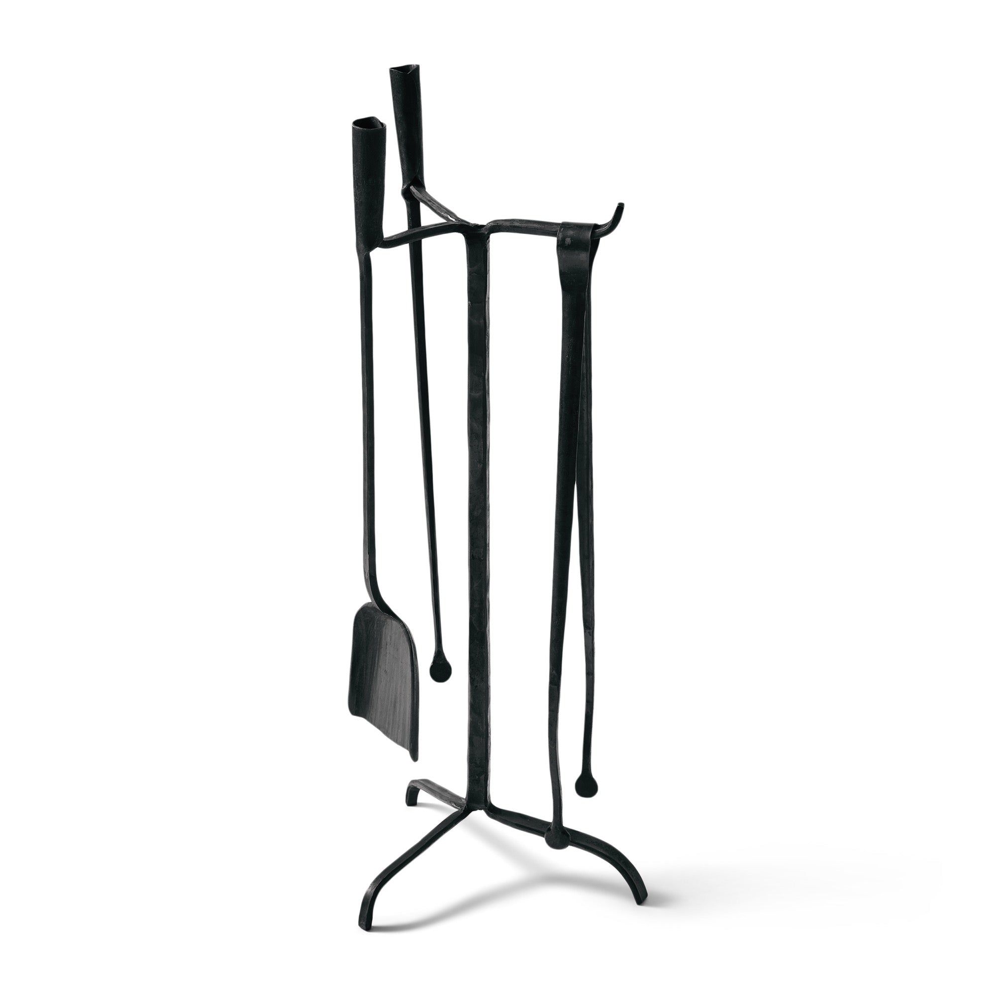 Minimal hand forged wrought iron fire tools displayed on a matching stand, featuring elegant curves and rounded finials.