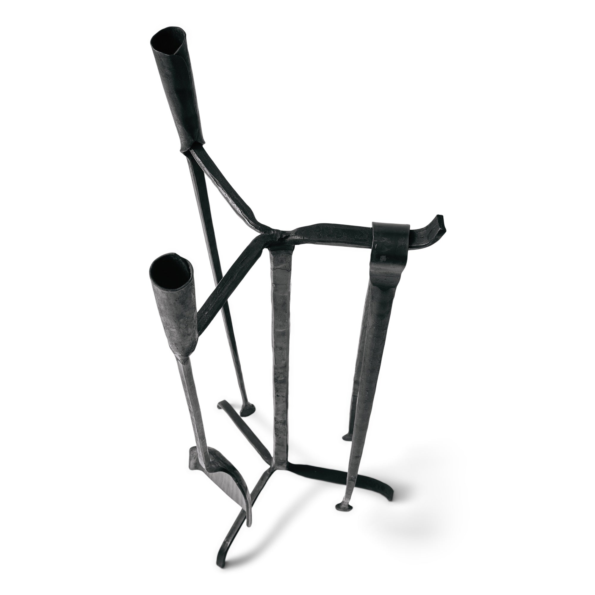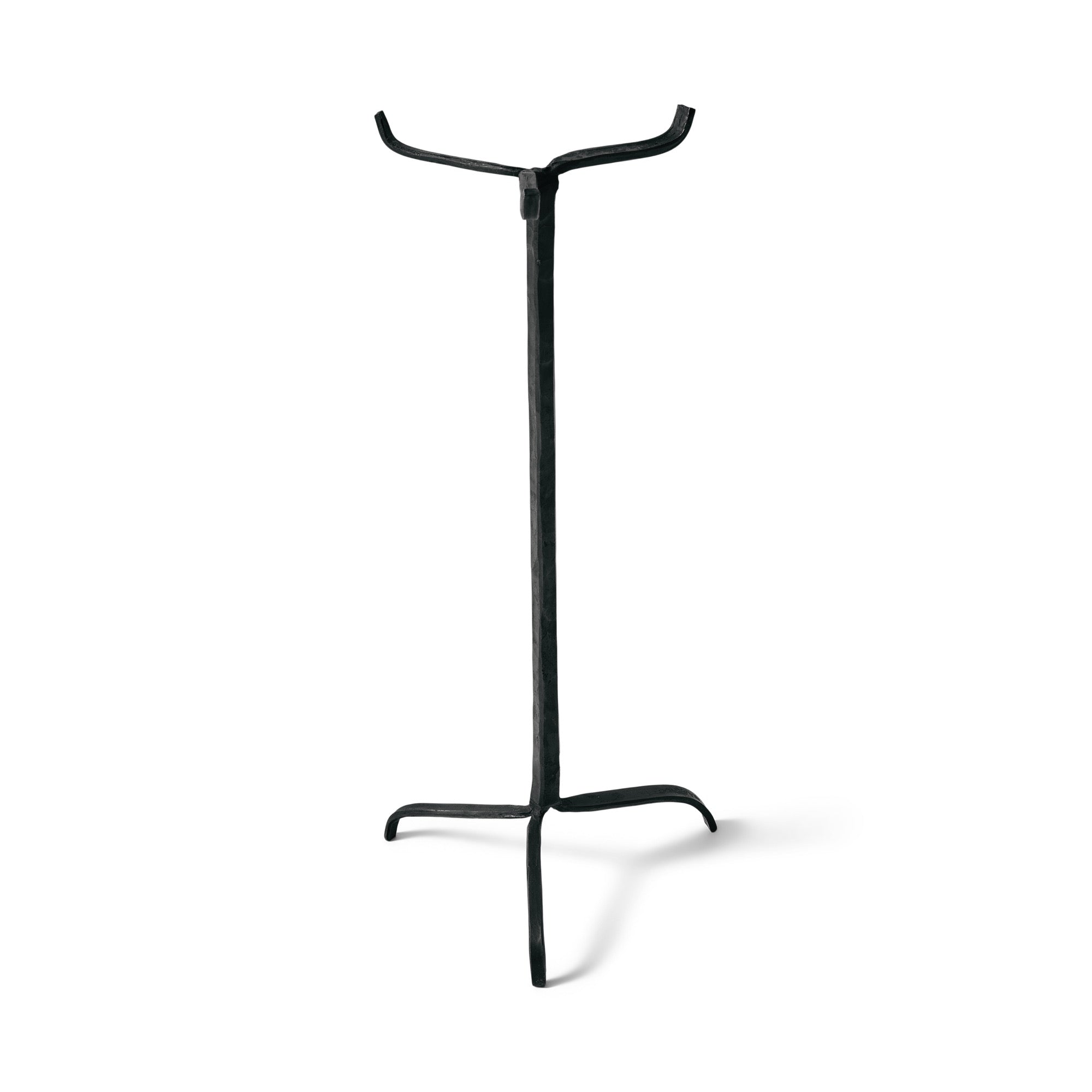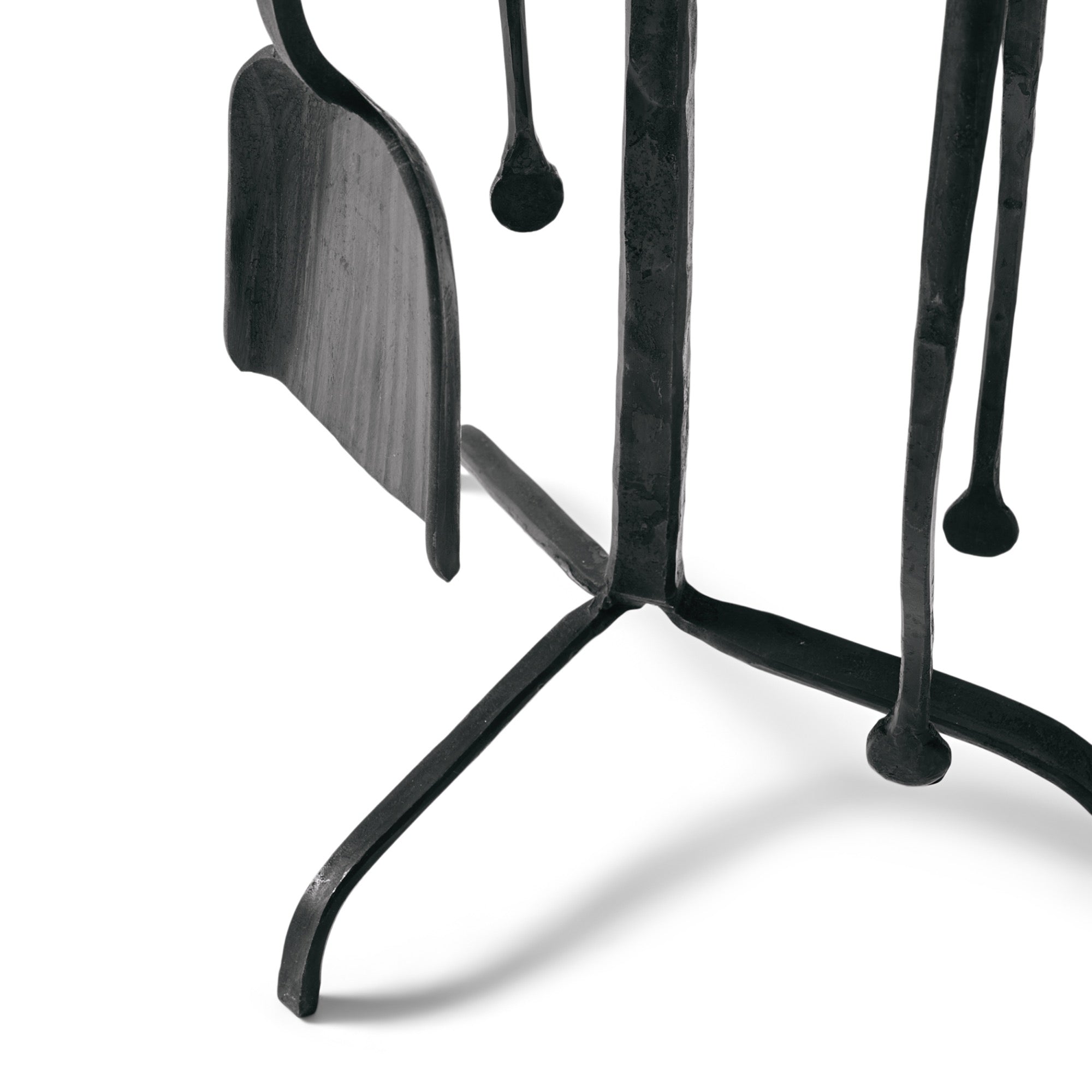 Minimal hand forged wrought iron fire tools displayed on a matching stand, featuring elegant curves and rounded finials.
