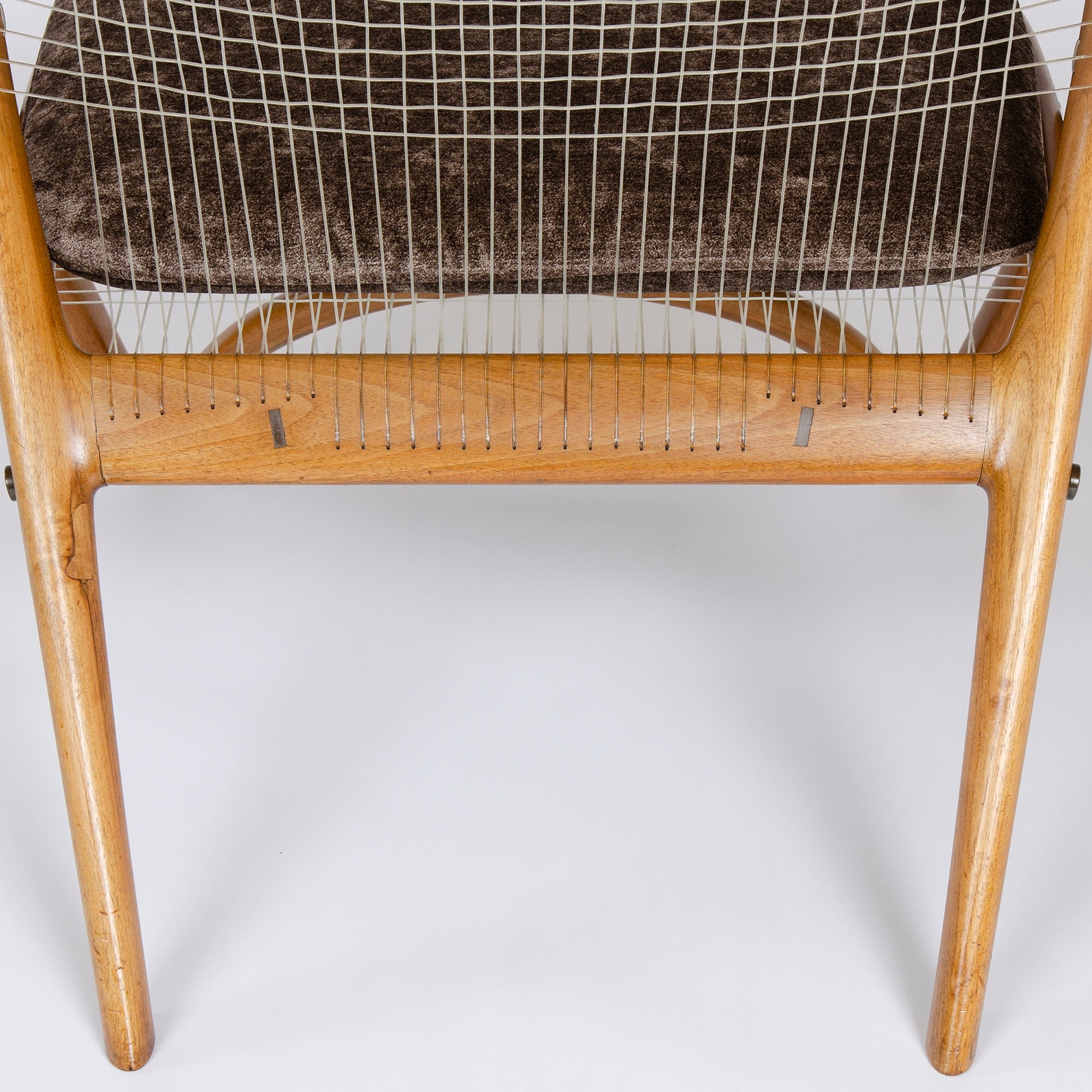 A very rare and meticulously crafted solid laminated walnut frame Racquet chair. The seat and back are woven and hand strung nylon, similar to a tennis racquet weave. The round headrest is adjustable in height by a bronze ball strung with nylon through the back frame. Seat and back pillow are upholstered in a lustrous woven cotton. The chair is marked on back stretcher with the original Peder Pedersen cabinetmaker decal.