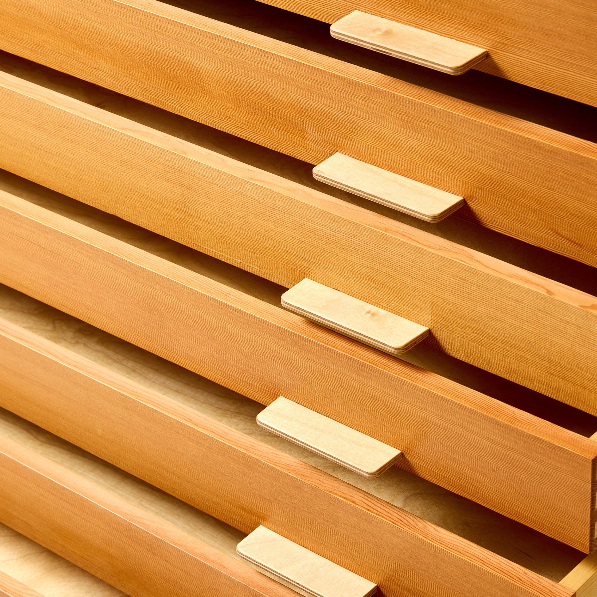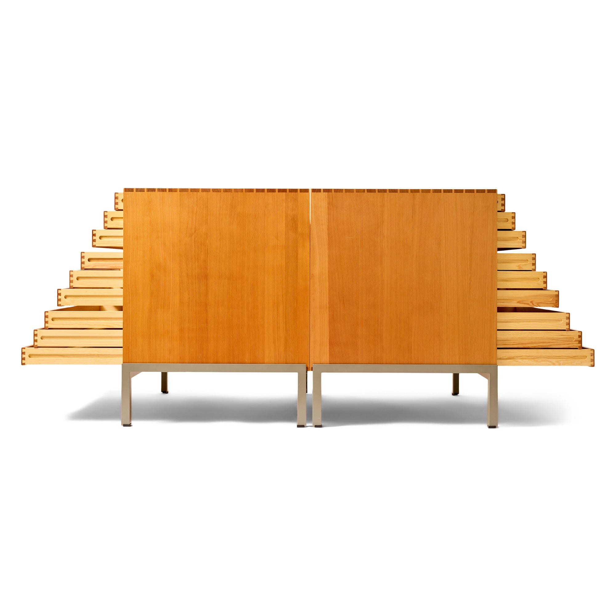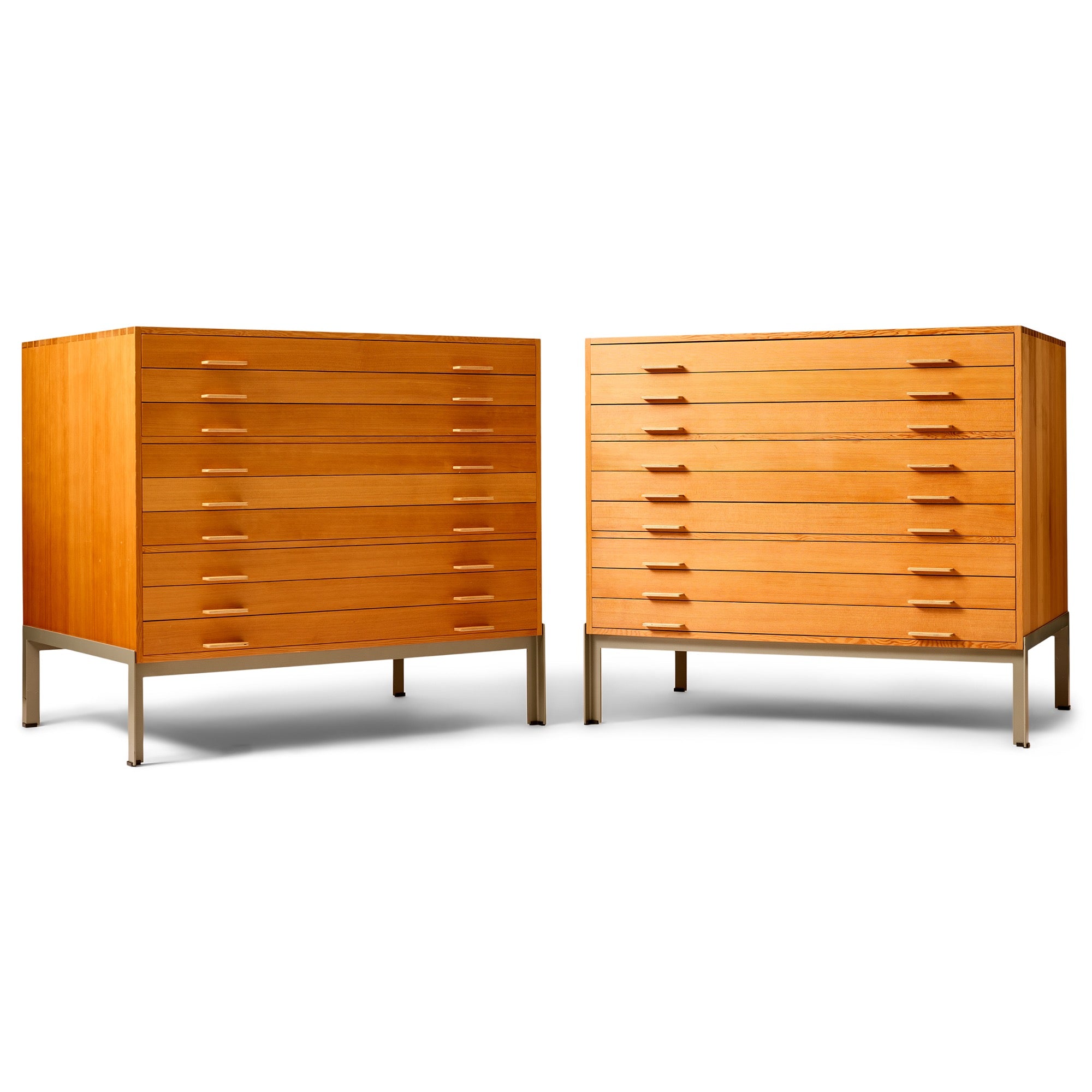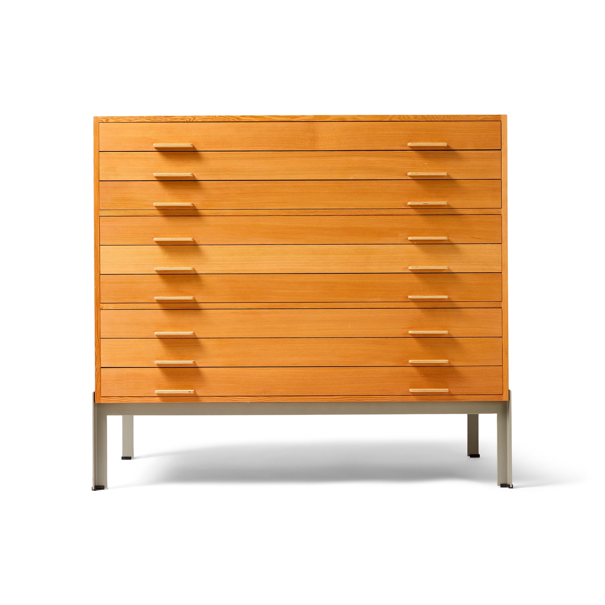 An impeccably detailed and constructed multi-drawer quarter sawn Oregon Pine flat file cabinet having nine (9) drawers with birch drawer bottoms, which become the drawer pulls, mounted on an angle steel base.